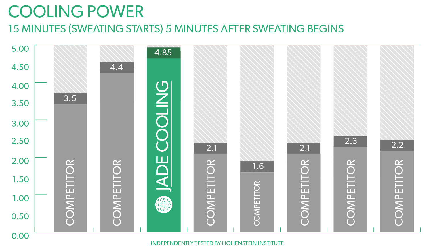 In hot weather, JadeCooling out performs most competitors fabrics by 100% and the industry leader by more than 10%. The testing covered moisture wicking and overall cooling over a 90 minute testing period. (Note: In very high humidity the towel may be less effective as air flow and evaporation is needed for the wicking properties to be felt)